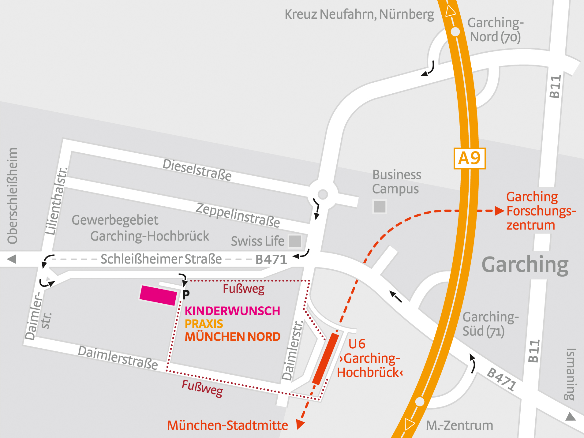 Aus Richtung Nürnberg: Über A9 Richtung München, Ausfahrt Garching Nord: Rechts abbiegen auf die B471 Richtung München/Dachau/Oberschleißheim dem Straßenverlauf der B471 folgen, geradeaus über den Kreisverkehr Richtung Dachau/Ismaning. An der Kreuzung rechts abbiegen auf die Schleißheimer Straße (B471) Richtung Dachau/Oberschleißheim. An der 1. Ampel (Daimlerstraße) links abbiegen und gleich durch einen U-Turn parallel der Schleißheimer Straße 300 m zurück fahren bis zur Praxis.